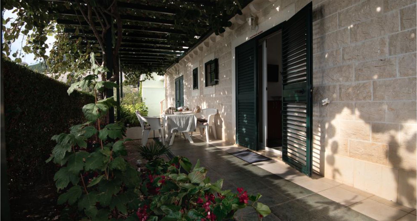 U sjeni izrađenoj od mediteranskog bilja možete uživati pijući domaće vino i okušati se u Vašim kulinarskim umjecima uz roštilj za izradu domaćih specijaliteta ili uz svježu ribu koja se može kupiti u malom gradu.